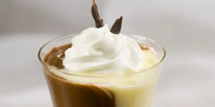 - Versez ces deux crèmes encore chaudes en même temps dans des verres. Donnez trois tours de fourchette pour marbrer. Servez bien frais.