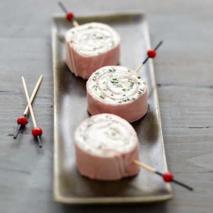 5 – Coupez les rouleaux de jambon en tronçons puis piquez-les d’un bâtonnet.