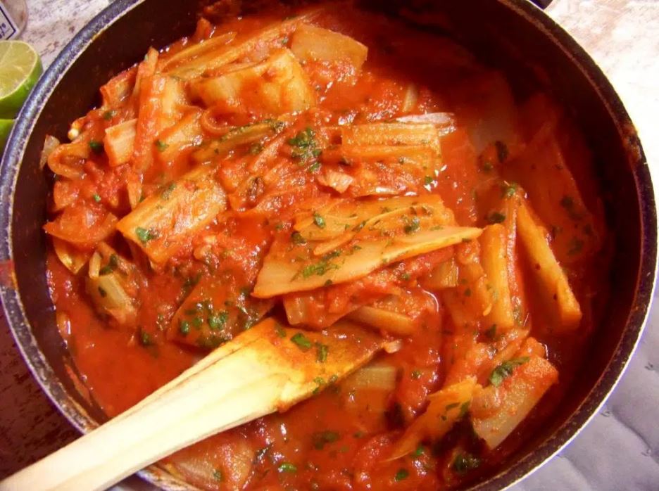 Faire sauter les feuilles de chou-fleur comme indiqué ci-dessus. Quand les feuilles sont cuites ajouter la viande. Bien mélanger et servir aussitôt avec un riz blanc.