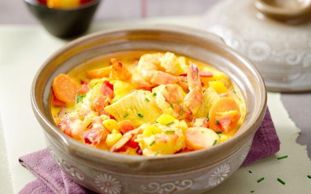 4 Versez le poivron dans la cocotte et prolongez la cuisson de 15 mn, jusqu’à ce que les légumes soient presque tendres. Ajoutez les morceaux de poisson et les scampis et faites cuire le tout, 5 ou 6 mn, en mélangeant souvent.