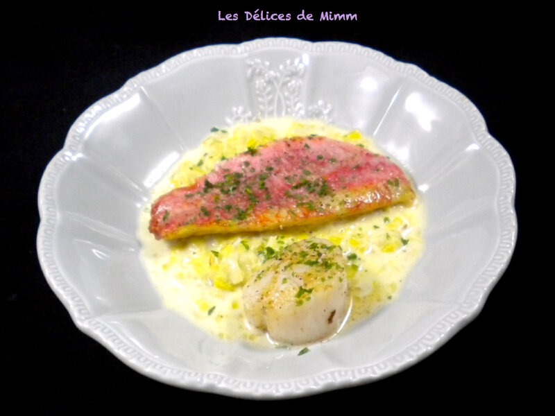 Filet de rouget et noix de Saint-Jacques sur crème de poireaux safranée