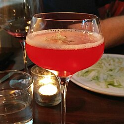 Filtrer dans un verre rempli de glaçons puis compléter le verre avec le champagne.