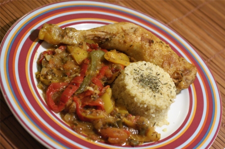 Pour finir… Le poulet basquaise se sert accompagné de riz, de pommes de terre cuites à l’eau, de semoule ou de boulgour. C’est au choix.