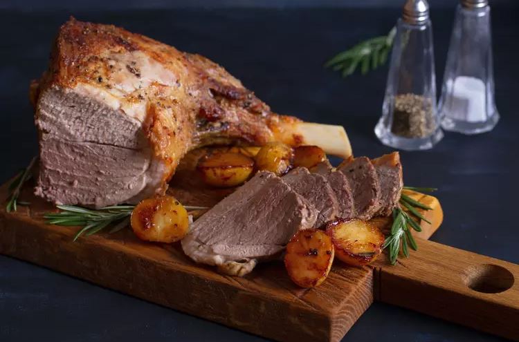 Gigot d’agneau à l’ail et au romarin, laqué au miel et à la moutarde