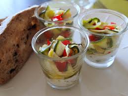 6 – Monter les verrines: une couche de poivrons et courgettes, puis une couche de mousse de sardine.