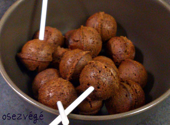 7 – Faire fondre 30 grs de chocolat au lait. Tremper un par un les bâtons de sucettes dans le chocolat et les planter dans les boulettes de gâteaux. Si la noisette est trop proche de l’extérieur replanter le bâtonnet ailleurs dans le cake pop et refermer le trou en repoussant la pâte avec les doigts. La texture du cake pop se prête facilement à cette petite tricherie. Replacer au frigo.
