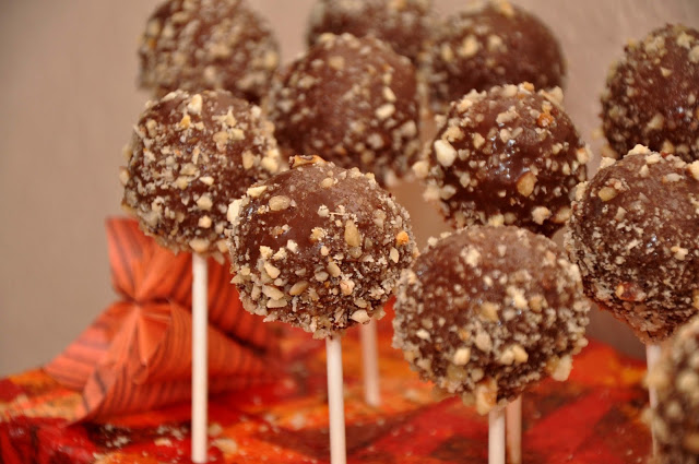 8 – Une fois que le chocolat a bien durci, faire fondre le reste du chocolat avec la crème. Tremper les cake-pop dans le chocolat. Laisser tomber l’excédent de chocolat du gâteau. Saupoudrer d’éclats de noisettes caramélisées. Laisser refroidir (encore au réfrigérateur) sur une assiette ou sur un support selon la présentation que vous voulez. Les cake-pop sont prêts.