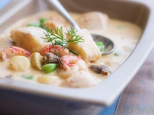 5 – Dans un bol, mélangez les jaunes d’œufs, le jus de citron et la crème. Fouettez avec un peu de jus de cuisson chaud. Versez sur les légumes et le poisson. Mélangez délicatement sans faire bouillir. Servez sans attendre.