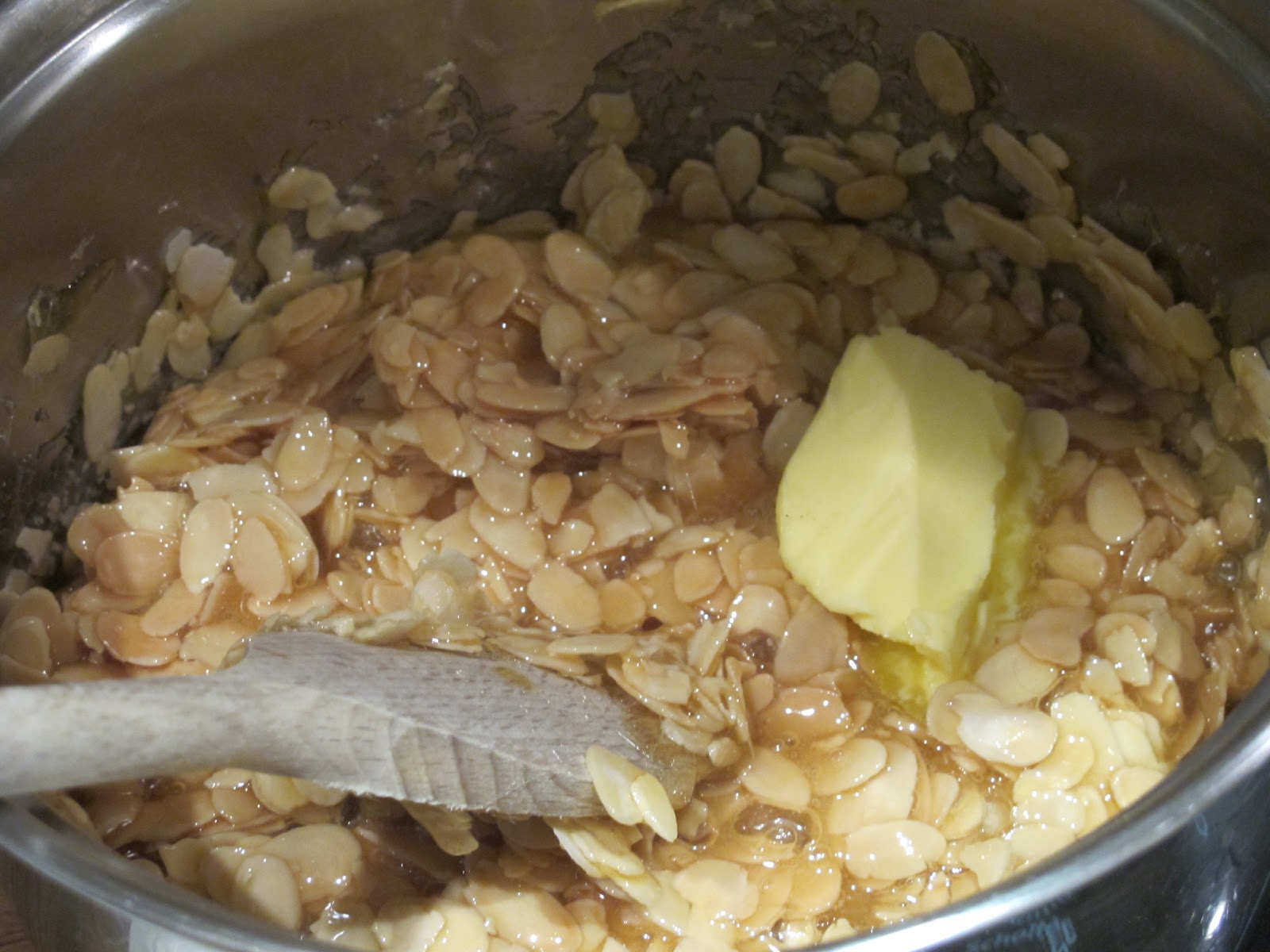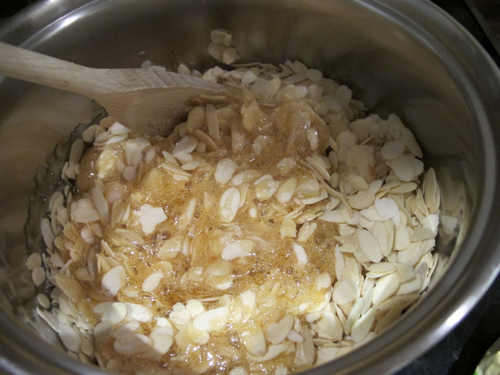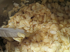 Incorporer les amandes effilées chaudes (pour éviter de faire un choc thermique avec le sucre cuit).