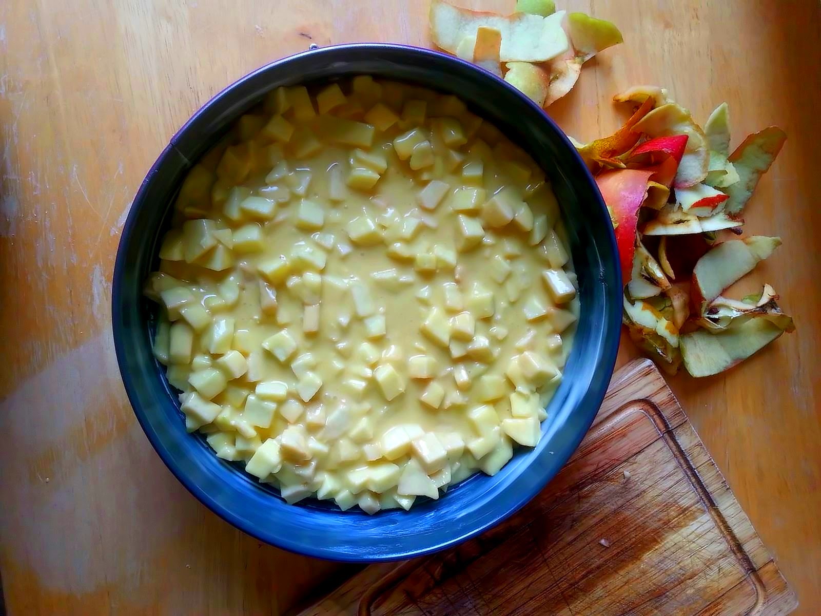 - A l’aide d’une spatule souple, ajoutez maintenant les pommes et mélangez doucement pour que la pâte les enroule uniformément.