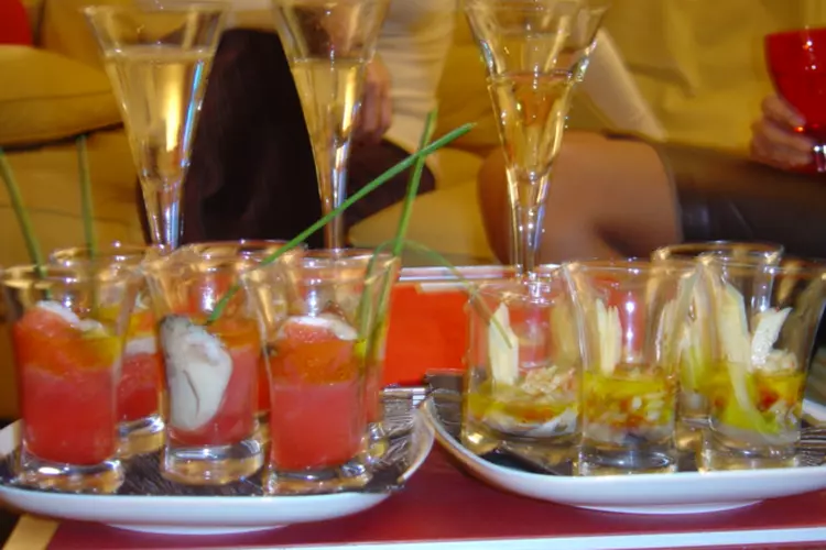 - Découper 2 quartiers de pommes, l’un en brunoise (tout petits carrés) et l’autre en julienne (très fins bâtonnets) Mélanger dans un bol, les dés de pomme, 2 cuillères à café d’huile d’olive, le jus d’un citron et les baies roses, poivrer généreusement. Disposer dans 4 verres à tequila quelques bâtonnets de pommes (verticalement le long de la paroi)ainsi qu’une huitre et arrosez le tout du mélange huile d’olive, dés de pommes et baies roses, terminez par une pincée de fleur de sel et de poivre fraîchement moulu !