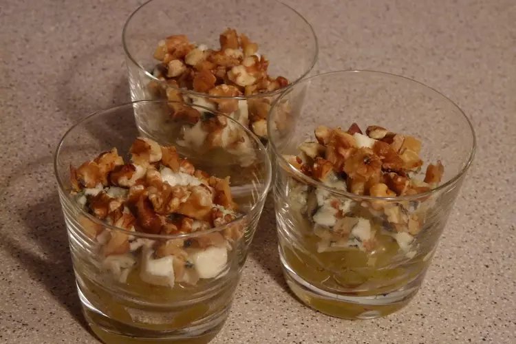 - Pour finir : Hâchez les cerneaux de noix en petits morceaux et répartissez-les sur le roquefort.