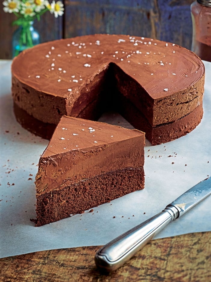 4. Montez les blancs d’oeufs en neige puis la crème en chantilly. Incorporez-les, dans cet ordre, à la préparation au chocolat. Versez dans le moule sur le gâteau et lissez. Couvrez et réservez au frais au moins 3 h. Démoulez et décorez éventuellement de fleur de sel.