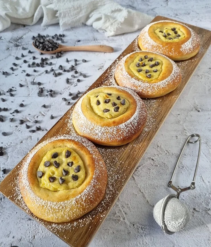 Crème pâtissière : Dans un récipient, blanchir les jaunes et le sucre, ajouter la maïzena, mélanger. Dans une casserole faire chauffer le lait avec la gousse de vanille fendu et grattée. A ébullition, enlever la gousse, puis verser la moitié sur le mélange sucre / œuf/ maïzena, mélanger Remettre dans la casserole, faire chauffer tout en fouettant pendant quelques minutes. Hors du feu ajouter le beurre. Débarrasser dans un récipient et entreposer au frigo. Montage : Dégazer la pâte sur un plan fariné. Étaler la sur 1 cm, puis découper des disques de 10 cm. Creuser un puit au centre, déposer de la crème pâtissière (refouetter la avant de l’utiliser). Dorer les bords de la brioche à l’aide d’un pinceau et de lait. Déposer sur une plaque et enfourner à 180° pendant 15 20 min (cuisson à surveiller selon le four) Laisser refroidir. Déposer des pépites de chocolat dans la crème pâtissière.