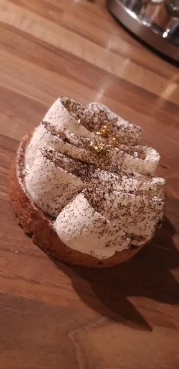 Poche votre crème sur votre tarte avec une douille à Saint-Honoré. Saupoudrez votre crème avec la poudre vanille et avec le nappage. Versez des gouttes dans les trous du pochage puis finissez avec de la feuille d’or.