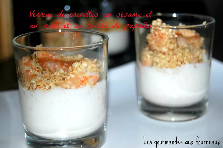 - Dans un bol, mélangez le fromage blanc avec le paprika, répartissez la préparation dans les verrines, réservez. Décortiquez les crevettes, et panez les dans le sésame, préalablement versé dans une assiette creuse. Faîtes revenir les crevettes quelques minutes, dans une petite poêle avec un filet d’huile d’olive. Ajoutez les graines de sésame restés dans l’assiette creuse dans la poêle, mélangez. Répartissez les crevettes dans les verrines, ajoutez une lichette de miel par dessus. Servez.