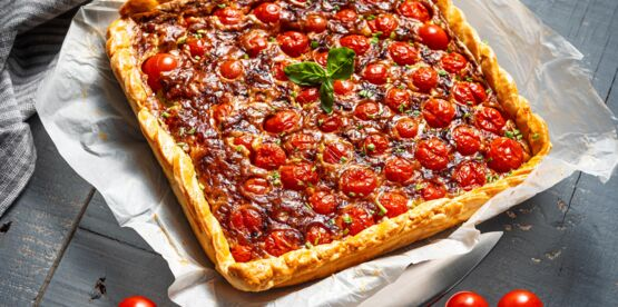 - Agrémentez votre tarte de basilic haché et de quelques petites feuilles.