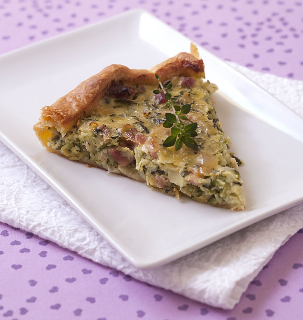 5 – Etalez la pâte et mettez-la dans un moule beurré ou avec du papier sulfurisé. Piquez le fond avec une fourchette. Répartissez-y le mélange lardons, oignons, courgettes. Versez les œufs et la crème.