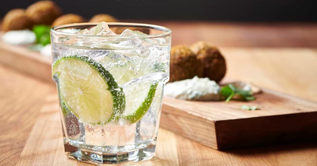 2 – Versez dans un verre, complétez d’eau gazeuse et ajoutez quelques rondelles de citron vert.
