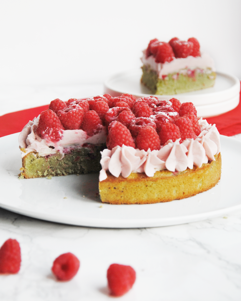 Il se compose d’un biscuit moelleux à la pistache, que vous pouvez réaliser en utilisant de la pâte de pistache  ou de la poudre de pistache. Sachez simplement que le goût sera légèrement plus prononcé si vous utilisez de la pâte de pistache.