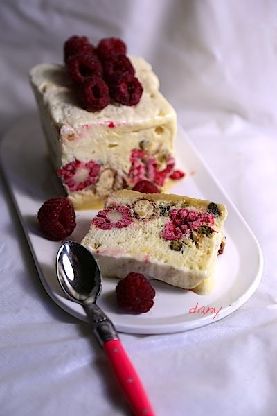Tranchez le nougât glacé, servez avec le coulis et le reste des framboises.
