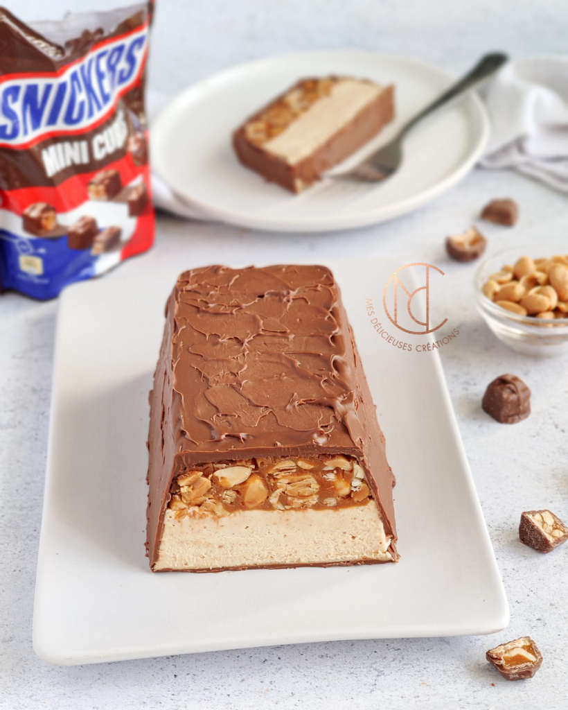 Laissez le Snickers 30 min au frais avant de le découper. Le cœur est encore congelé, c’est tout à fait normal. Laissez les parts 15 min à température ambiante et dégustez.
