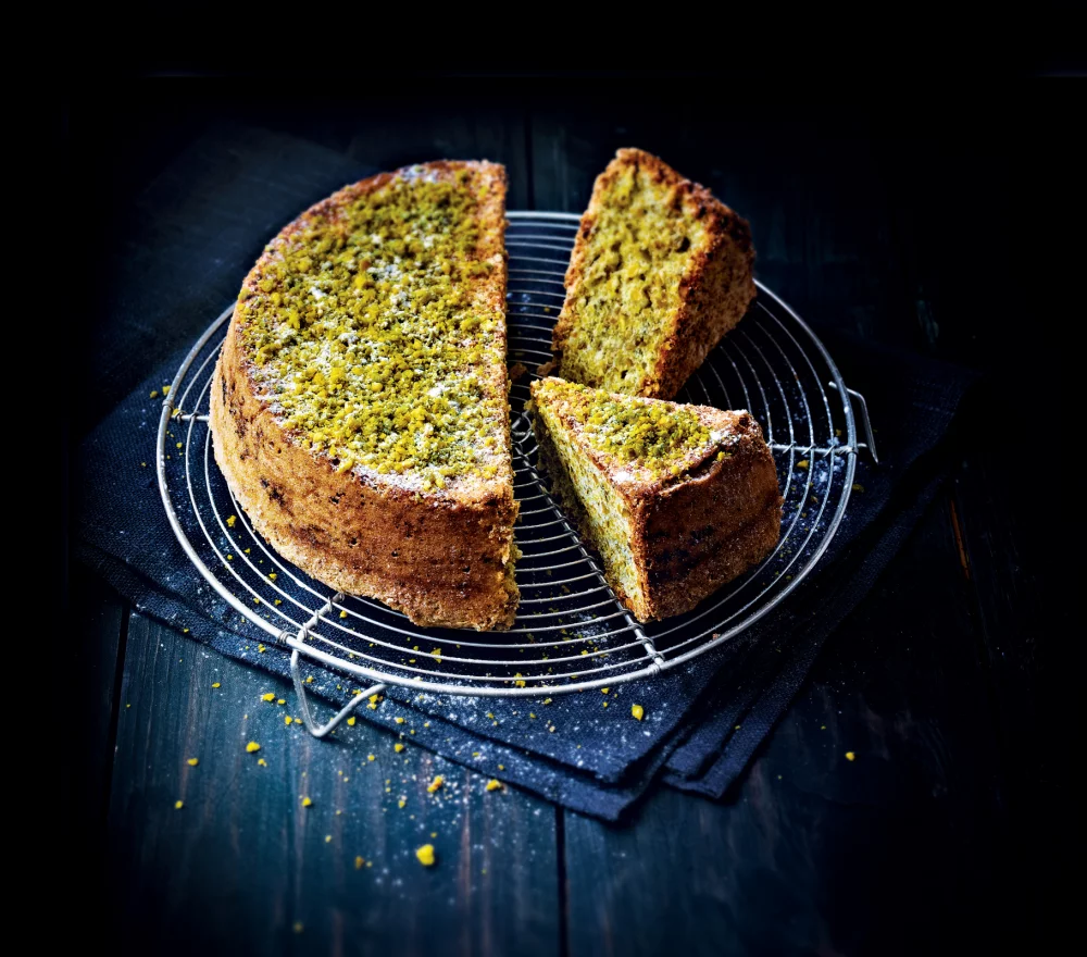 - Lorsqu’il est cuit, laissez le gâteau reposer hors du four avant de le démouler. Laissez-le refroidir, puis poudrez-le du mélange aux pistaches hachées.